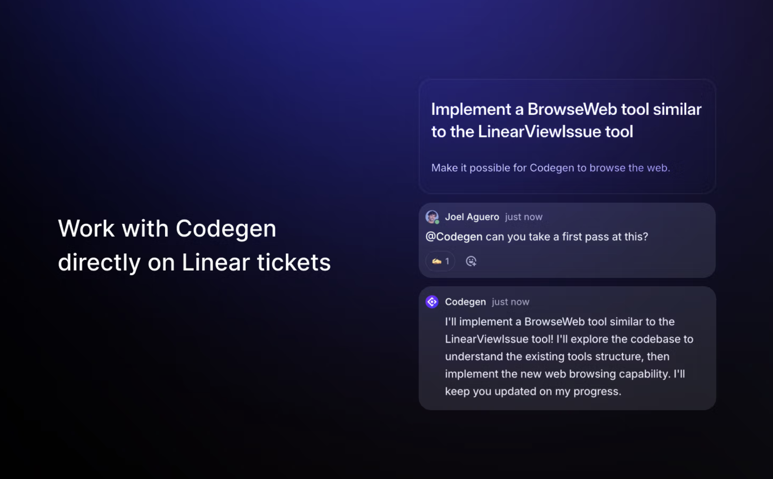 Linear is designed to orchestrate teams of humans and agents working together. It’s the most efficient way to track progress and scale teams of agents to tackle large, complex tasks. Codegen can take a first pass at virtually any issue, breaking down work and making meaningful progress before human review. We recommend letting Codegen handle the initial exploration and implementation of most tasks.